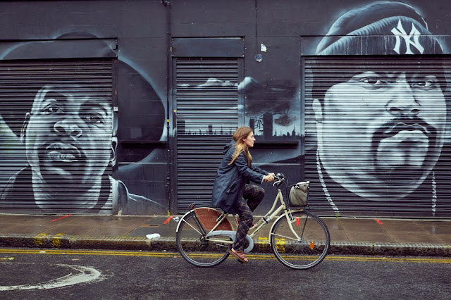 A cyclist passes murals on shop shutters at the junction of Coldharbour Lane and Atlantic Road in the Brixton district of London. To curb cars, the city is establishing several “low-traffic neighborhoods” in the area.